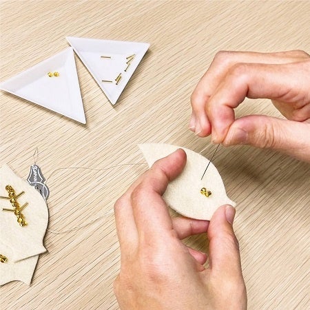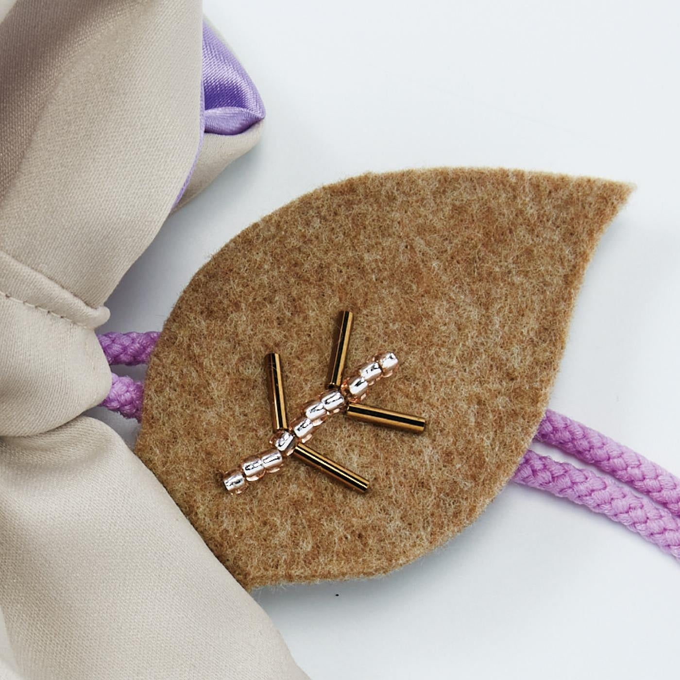 葉っぱのビーズ刺しゅうは、「NPO法人 萌友」、「夙川さくら作業所」、「夢っとぴあ」の3施設で制作しています。ビーズ刺しゅうが美しく見えるように、ビーズの緩みに注意して、ていねいに刺しゅうをしています。裏側になるべく縫い目が出ないように、気を付けてすくい縫いをしています。