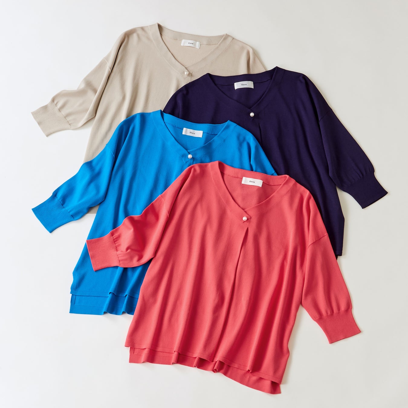 フロントのタックデザインとパールボタンがアクセントになったシンプルながらも上品なデザインは、オンオフ問わず様々なシーンで着回しやすいのが魅力です。Eluraで長く愛されてきたサラサラタッチシリーズと同素材を使用。さらりとした清涼感が魅力の素材で、これからの暑い季節も快適に過ごすことができます。また、毛玉になりにくいアンチピリング機能付きで日常のお手入れもしやすいアイテムとなっています。