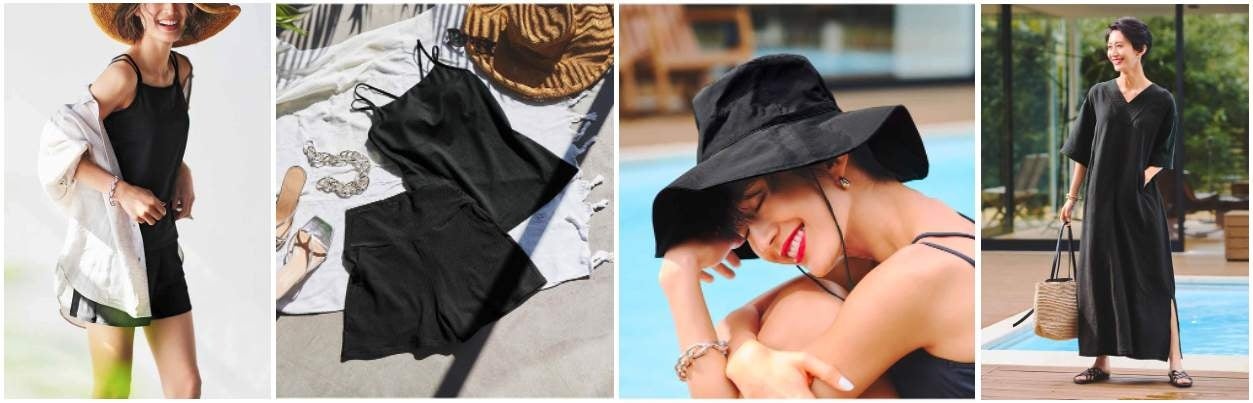 見せたくないところはしっかり隠せて服感覚で着用できるデザイン性と、水辺での実用性を兼ね備えた水着です。また、今年は「ラッシュガード」、撥水素材を使用した「水陸両用UVカットハット」、大人シックな「コットンワンピース」といった、夏の水辺遊びが楽しくなるラインナップが充実しています。