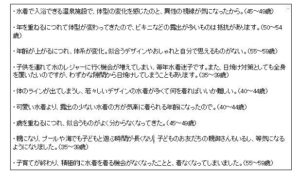 ・水着で入浴できる温泉施設で、体型の変化を感じたのと、異性の視線が気になったから。(45~49歳) ・年を重ねるにつれて体型が変わってきたので、ビキニなどの露出が多いものは抵抗があります。(50~54歳) ・年齢が上がるにつれ、体系が変化。似合うデザインやおしゃれと自分で思えるものがない。(55~59歳) ・子供を連れて水のレジャーに行く機会が増えてしまい、毎年水着迷子です。また、日焼け対策としても全身を覆いたいのですが、わずかな隙間から日焼けしてしまうこともあります。(35~39歳) ・体のラインが出てしまうし、若々しいデザインの水着が多くて何を着ればいいか難しい。(40~44歳) ・可愛い水着より、露出の少ない水着の方が気楽に着られる年齢になったので。(40~44歳) ・歳を重ねるにつれ、似合うものがよく分からなくなってきた。(45~49歳) ・親になり、プールや海でも子どもと遊ぶ時間が長くなり、子どものお友だちの親御さんもいるし、等気になるようになりました。(35~39歳) ・子育てが終わり、積極的に水着を着る機会がなくなったことと、着なくなってしまいました。(55~59歳) |