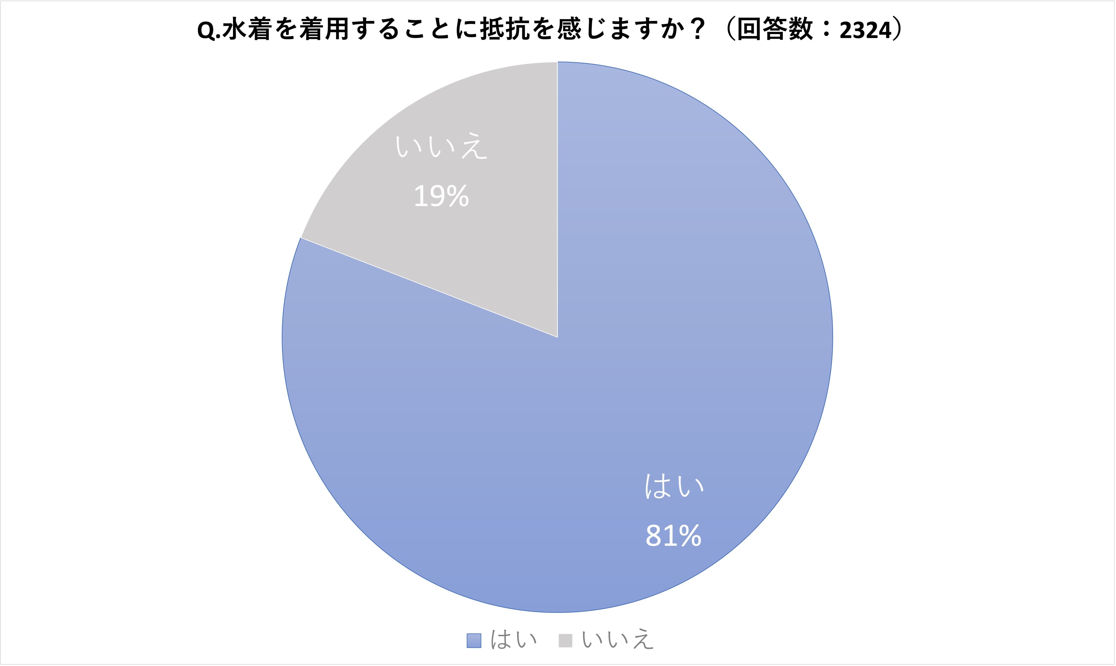 「水着を着用することに抵抗を感じますか?」と質問したところ、「はい」が81%、「いいえ」が19%の回答結果となりました。この結果から、多くの女性が水着の着用に抵抗感があることが見えてきました。