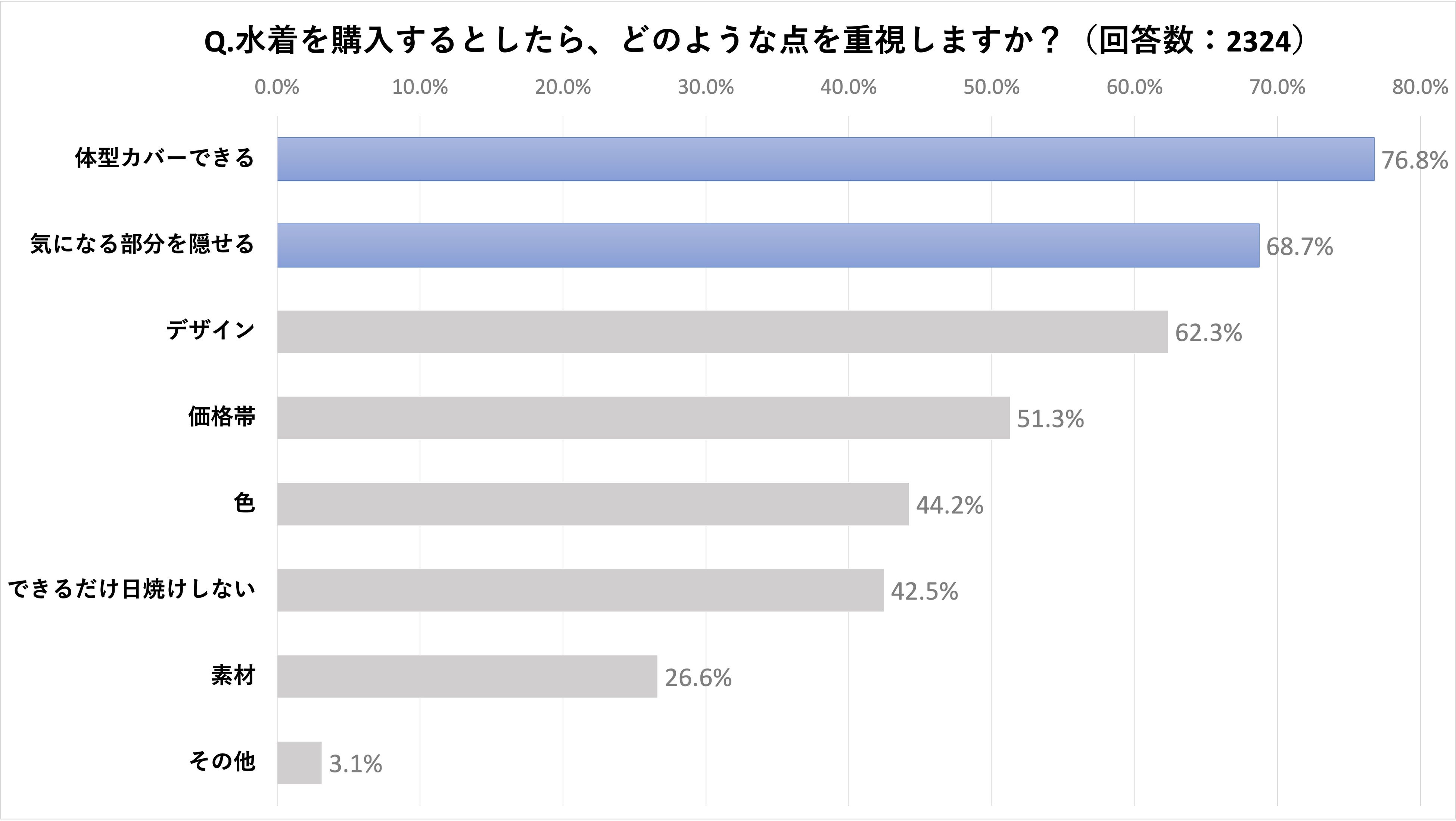 「水着を購入するとしたら、どのような点を重視しますか?」と質問したところ、「体型カバーできる」が76.8%、「気になる部分を隠せる」が68.7%という結果となりました。