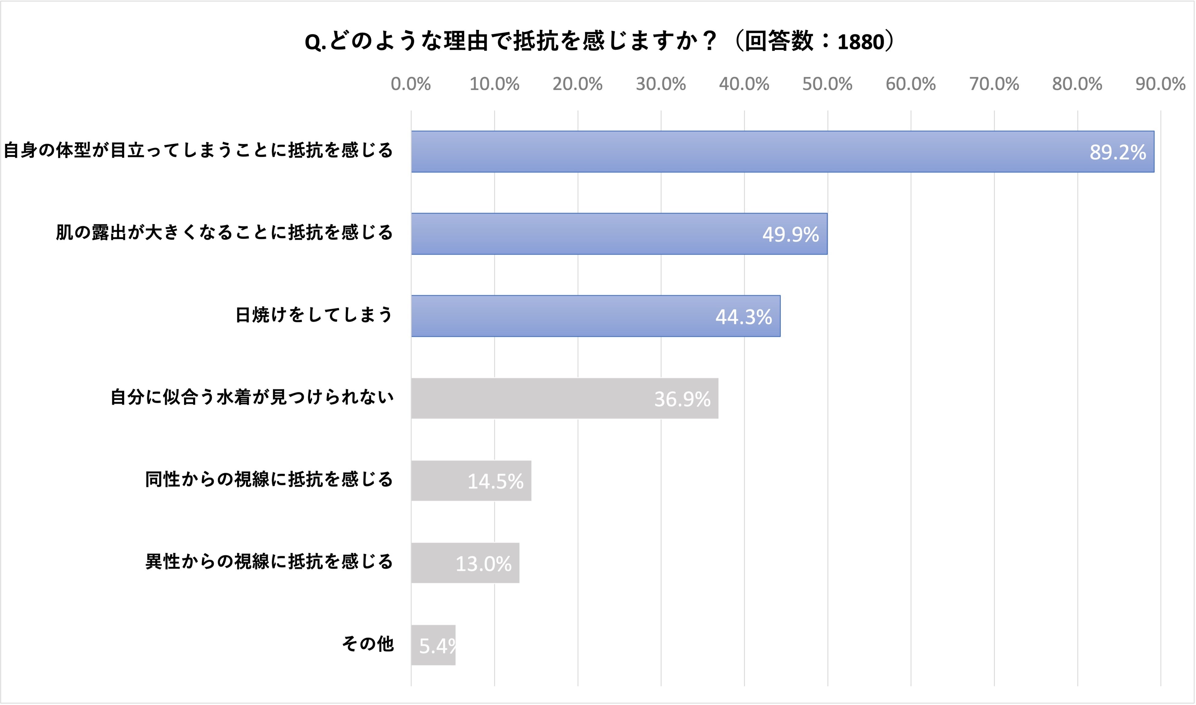 この結果から、水着を着用することで「自身の体型が目立ってしまう」ことに抵抗を感じる方が多いことがわかりました。