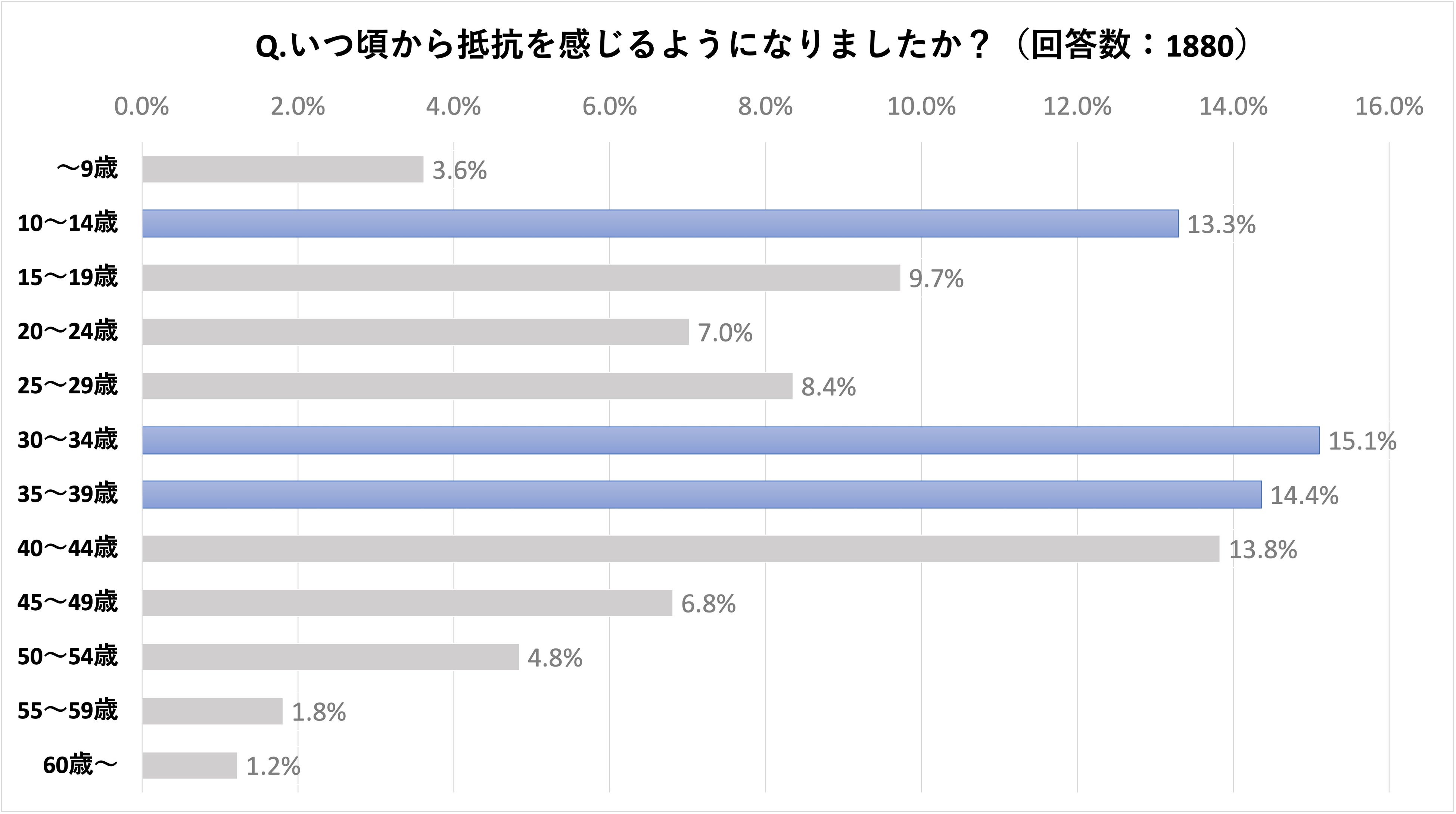 「いつ頃から抵抗を感じるようになりましたか?」と質問したところ、「30〜34歳」が15.1%、「30〜34歳」が14.4%、「10〜14歳」が13.3.%という結果となりました。