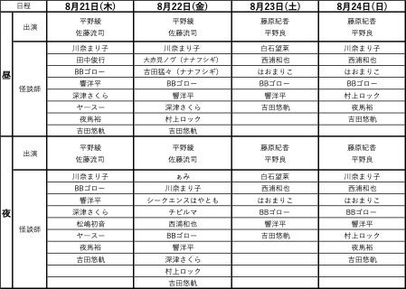 さらに、怪談師による実話怪談披露やトークセッションなど盛り沢山な内容を企画中!怪談師は日替わりで、ぁみ、川奈まり子、シークエンスはやとも、白石望莱、田中俊行、チビルマ、大赤見ノヴ(ナナフシギ)、吉田猛々(ナナフシギ)、西浦和也、はおまりこ、BBゴロー、響洋平、深津さくら、松嶋初音、村上ロック、ヤ―スー、夜馬裕、吉田悠軌(五十音順)が出演します。
