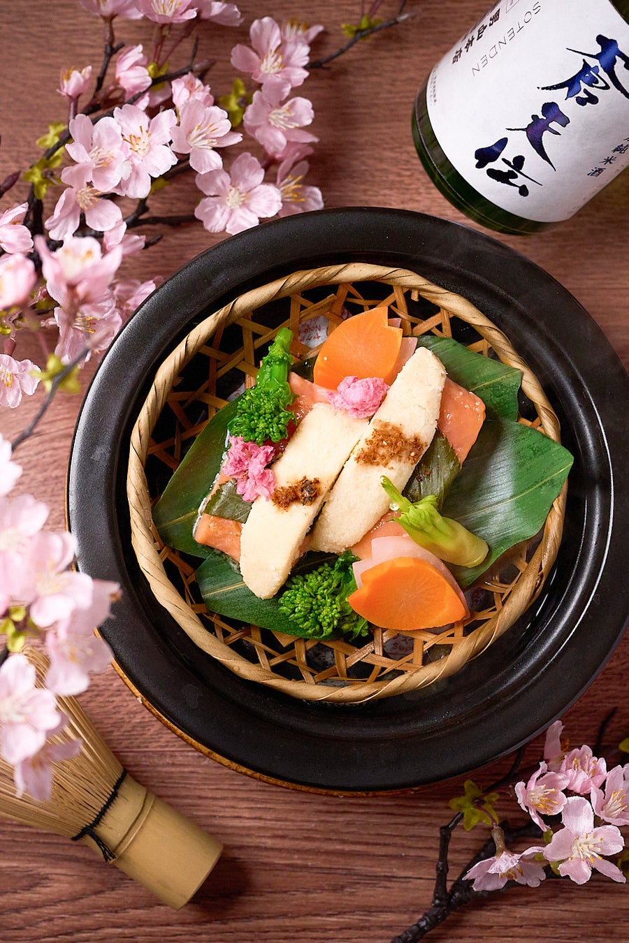 メイン素材である「みやぎサーモン」は、生食を推奨されるほど鮮度が良く、とろけるような食感と甘みのある肉質が特徴です。塩麴で下味をつけた身に、火が入りすぎないよう練ったおからと香りづけの桜葉を纏わせ短時間蒸すことで、しっとりとした滑らかな食感と桜の香りが口いっぱいに広がります。ほんのり苦みのある色鮮やかな山菜や、桜の花びらを模した根菜が料理に華を添え、爛漫の春を演出。仕上げに桜の香りを移した豆乳餡を茶筅で小気味よく泡立てた、和製“えすぷーま”を掛けて完成です。料理には、大豆から取れるおからのほか、調理の過程で出る出汁がらを再利用した鰹節粉も使用し、フードロス削減に貢献しています。