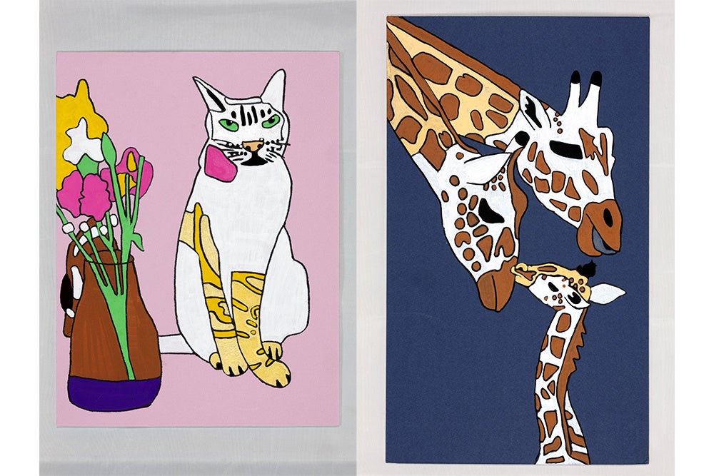 パラアーティスト木下晃希の作品に登場する動物たちは、まるで今にも動き出しそうなほど鮮やかで生き生きとした表情で描かれている。優しく個性的な表情が印象的で、その動物たちが実際に目の前にいるかのよう。彼の動物への深い愛情が作品の魅力を生み出している。