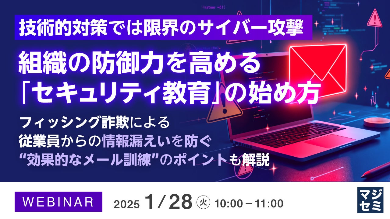 マジセミ株式会社は「技術的対策では限界のサイバー攻撃、組織の防御力を高める「セキュリティ教育」の始め方」というテーマのウェビナーを開催します。