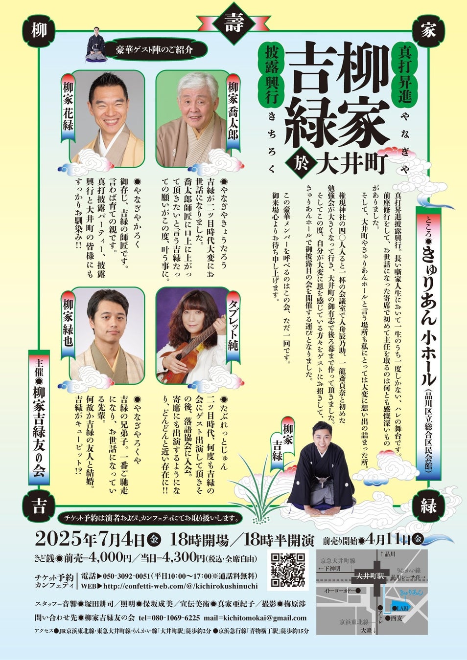 柳家吉緑友の会主催、『柳家吉緑真打昇進披露興行 於 大井町』が2025年7月4日 (金)にきゅりあん 小ホール(品川区立総合区民会館)(東京都品川区東大井5-18-1)にて開催されます。