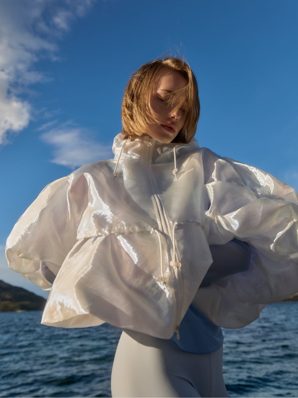 軽くエアリーな素材感のナイロンを使用し、気軽に羽織れて着映えするデザインにこだわった1着。今回クリアな印象のWHT・LBLUと、キラキラと表面にほのかな光沢感のあるCLAの3色展開です。CLAカラーのみオーガンジーにしています。