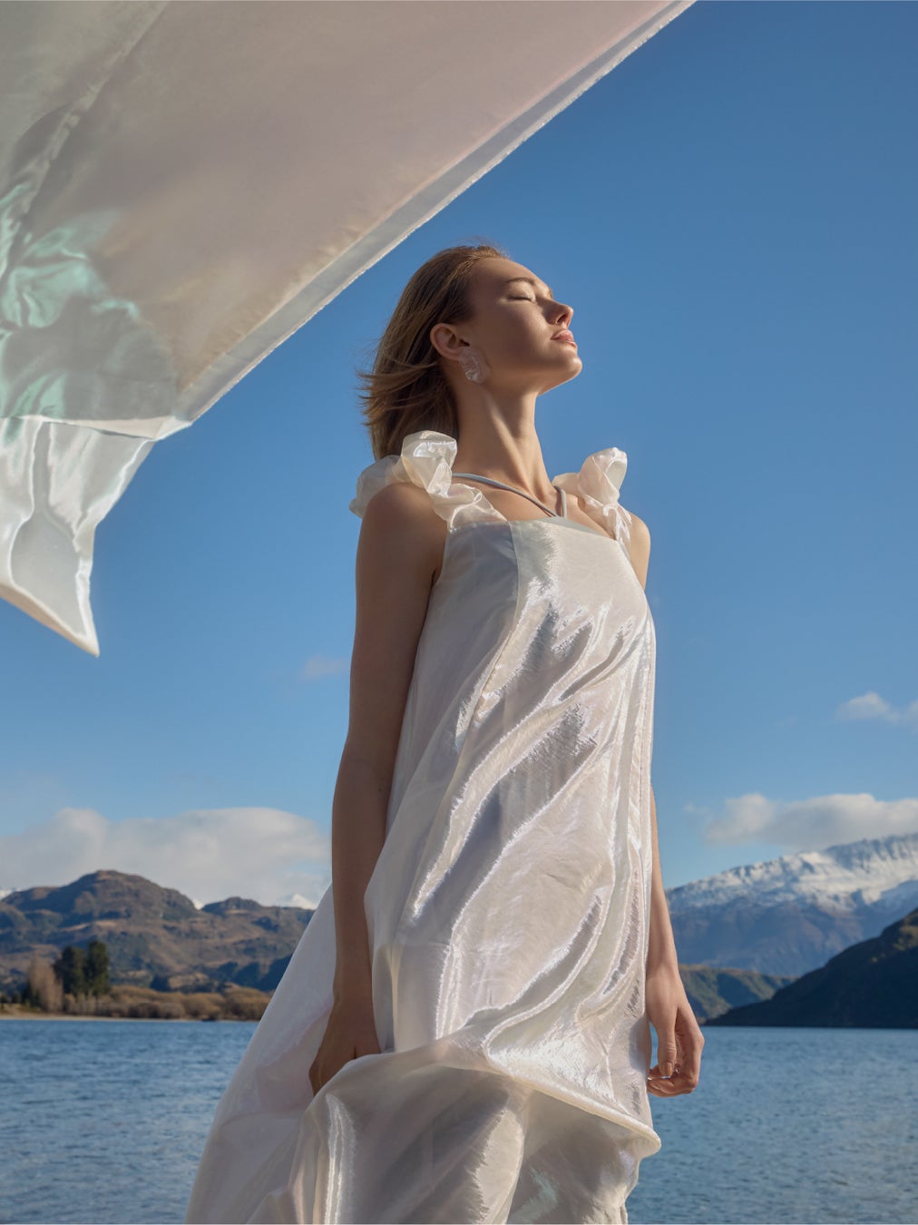 今回のコラボのために撮影した水面の輝きや、風になびいている布たちの写真を大きくプリントしたフォトTシャツ。今回のコラボを表現しているような、透明感たっぷりの印象を与えてくれる美しい写真がポイント。ユニセックスで着用できるサイズ展開のアイテムを、リユース可能なパッケージでラッピングしています。