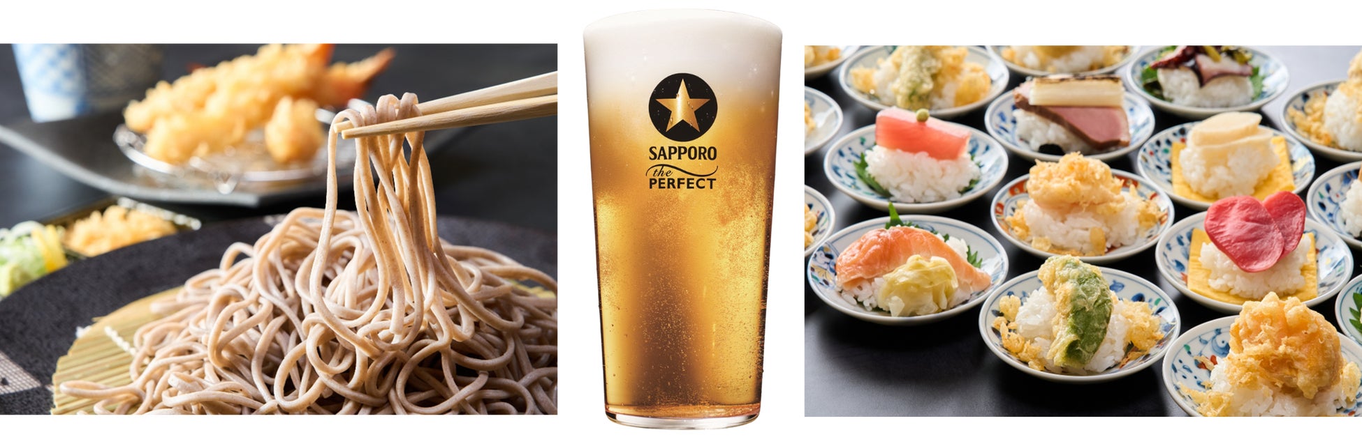 蕎麦酒(そばとビール)の“粋”に欠かせないビールは、おいしさに徹底的にこだわります。提供品質にこだわり抜いた泡までおいしい樽生ビール「ザ・パーフェクト黒ラベル」と、現存する日本で最も歴史のある瓶ビール「サッポロラガービール」をご用意しています。