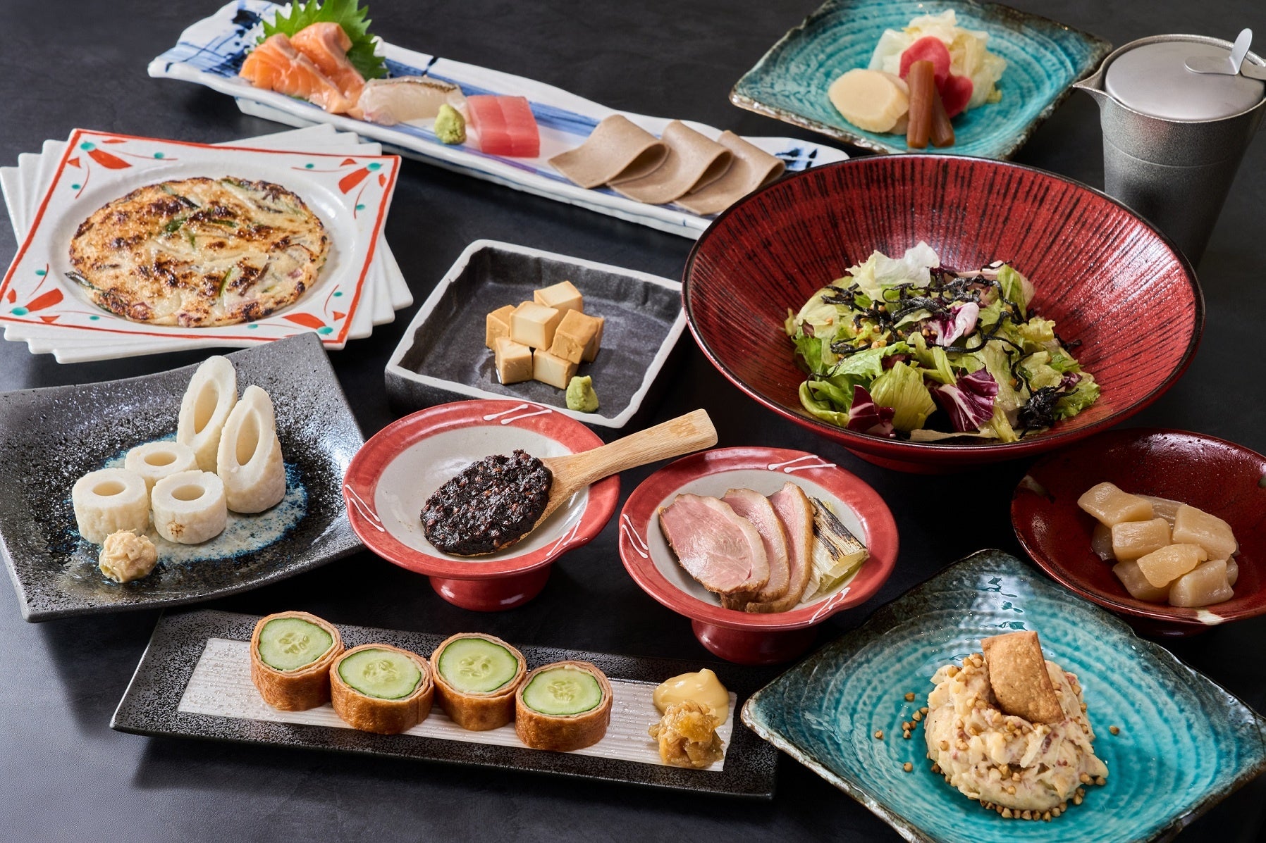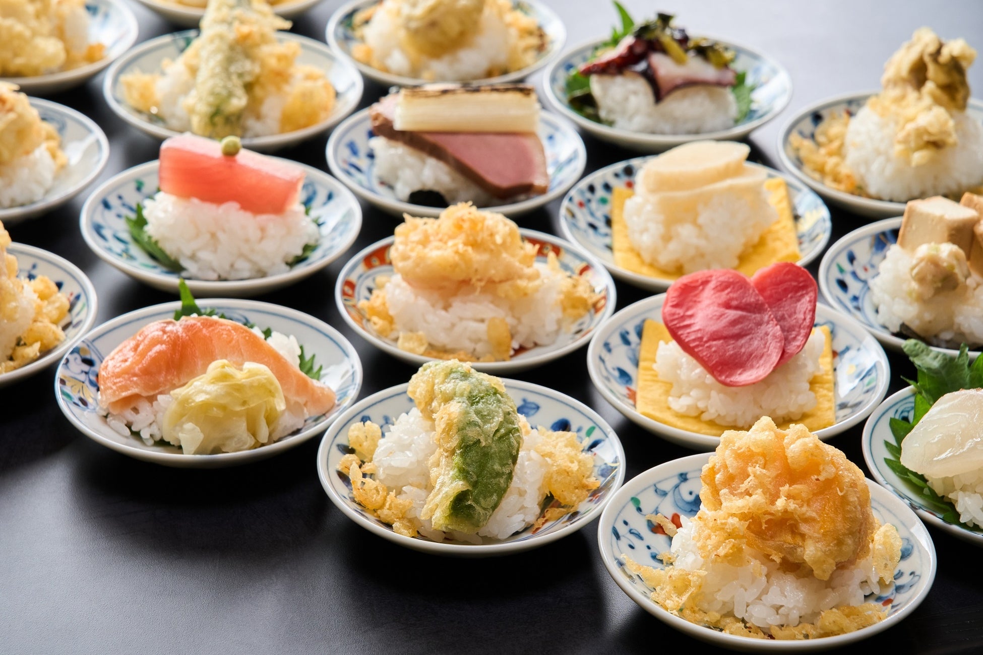 そばまえのお供には、季節の食材を使った天ぷらや、魚の刺身や天ぷら・漬物などが乗った色々楽しめる小皿寿司、愛知ならではの食材である「ヤマサちくわ」や「絹姫サーモン」などを使用した酒の肴をご用意しています。