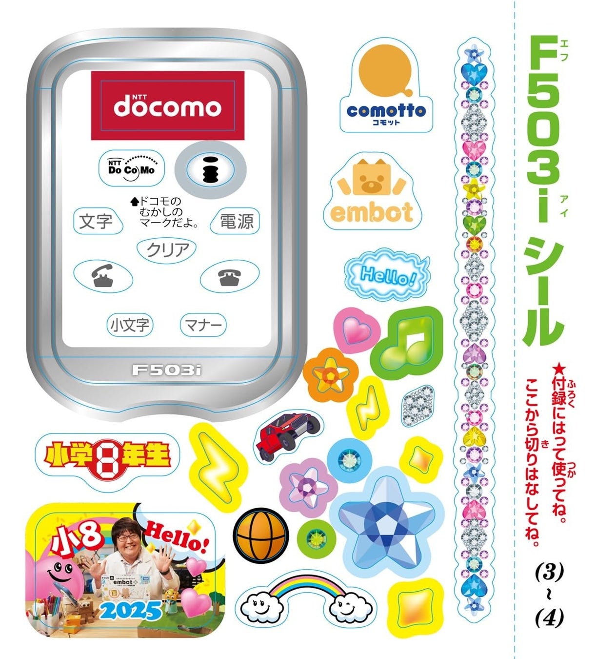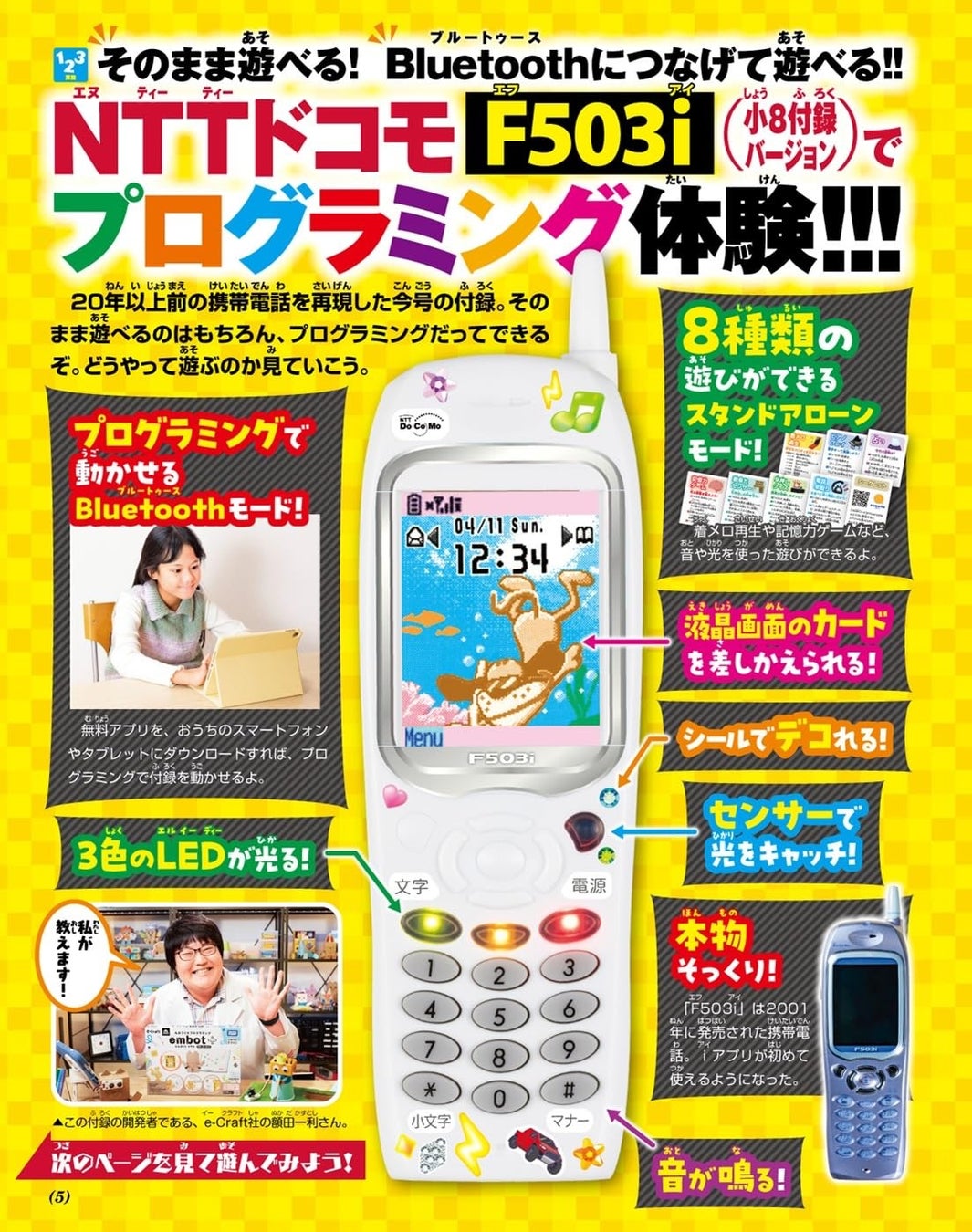 学年誌付録初!Bluetoothも搭載!!ケータイ型プログラミング体験付録「NTTドコモ F503i」が、2月28日ごろ発売の『小学8年生』はじめてのプログラミング号で手に入る!