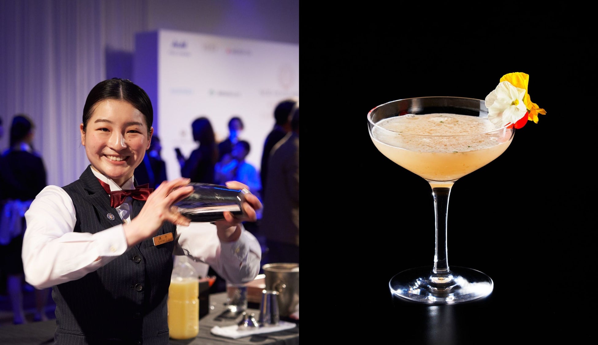 今回新設された「ノンアルコール部門」で、初代チャンピオンに輝いた「ホテルニューオータニ大阪」の清水 砂甫(しみず さほ)。「新鮮さを保つという意味を持つ、アイボリー。ホテルニューオータニを60年間支えてくださった皆さまへの感謝の気持ちをブーケに込めて。この先も共に、未来に向かって歩いていけるように」と願いを込めた作品『アイボリーブーケ』は、グレープジュースをベースに、ローズやバニラがふんわりと香る、華やかで優しい味わいに仕上げました。