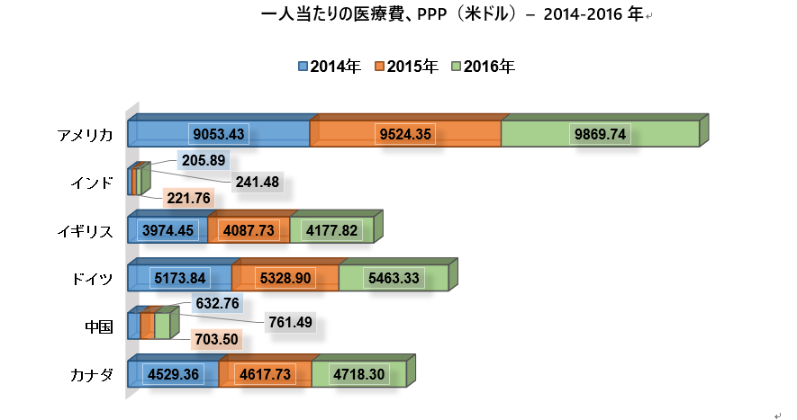 一人当たりの医療費、PPP(米ドル)– 2014-2016年