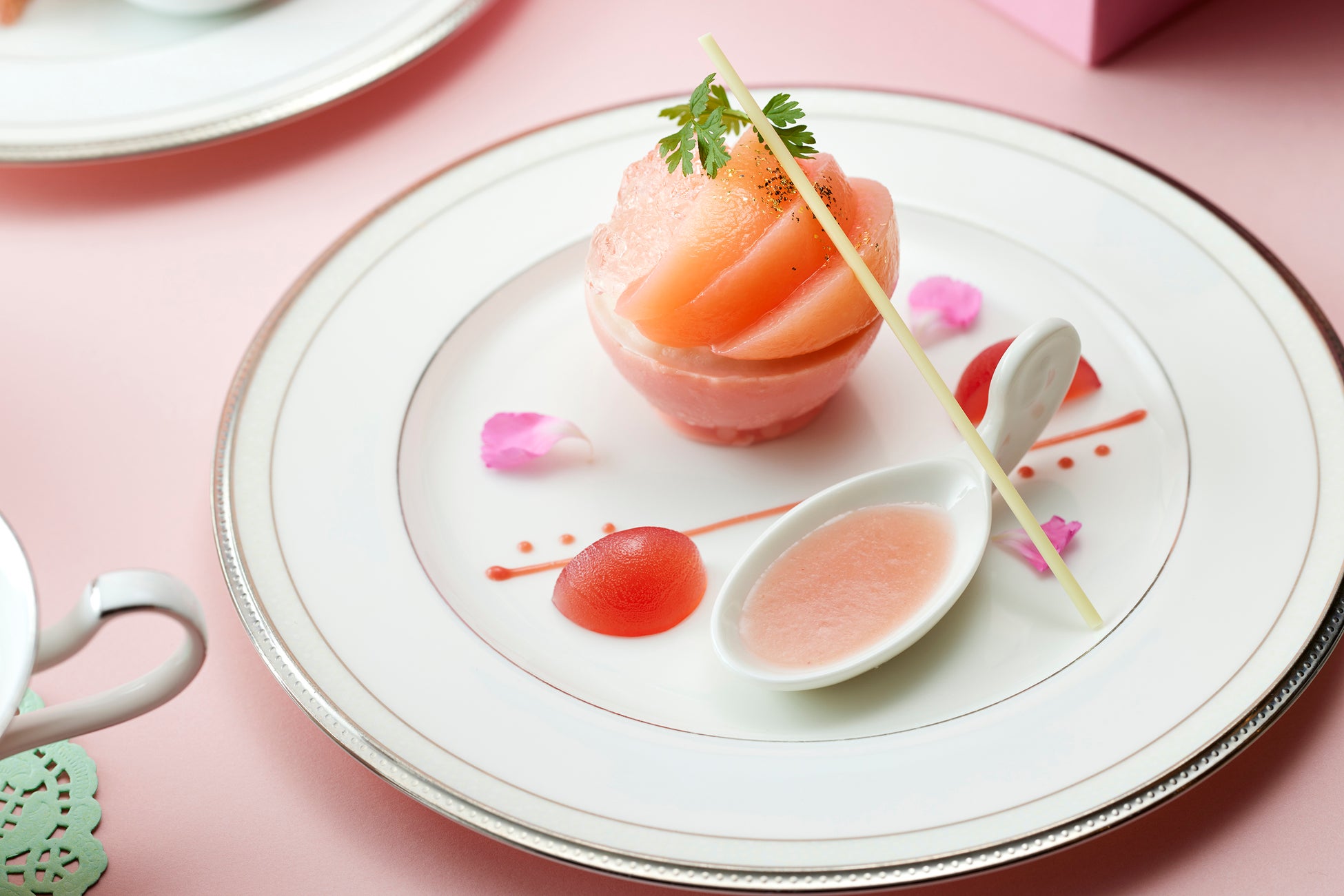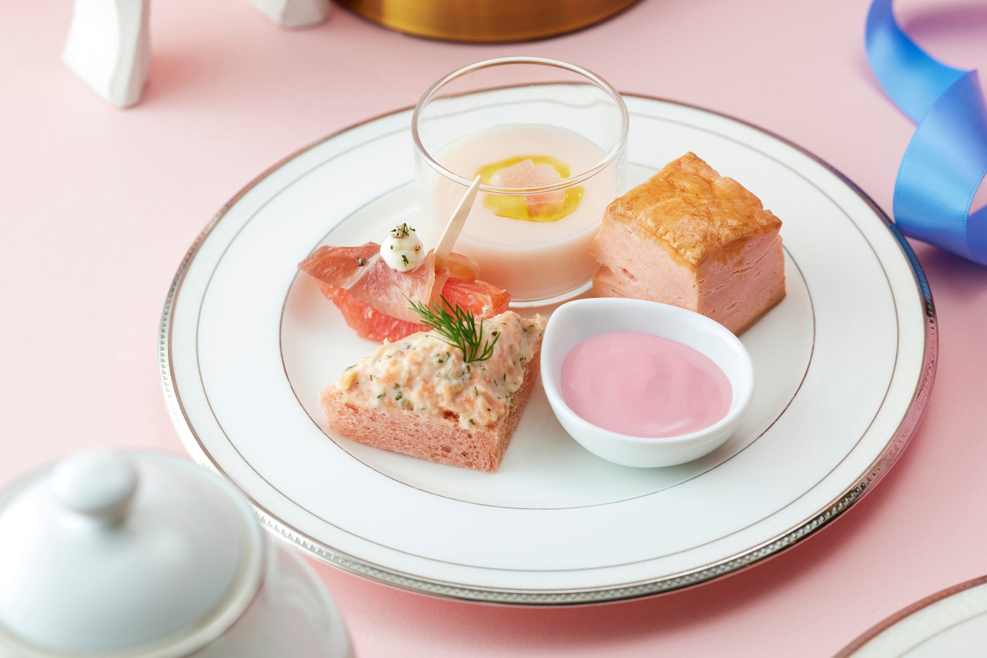 上段の「赤桃のムース 東北産あかつき桃のコンポート ソースペーシュ」は、赤桃のムースの中にさっぱりとした桃のゼリーを入れ、周りをピンクのチョコレートでコーティングしました。緻密な果肉と甘い果汁をたっぷり含んだ東北産のあかつき桃のコンポートとジュレペーシュを乗せ、丸く可愛らしい桃そのものをイメージした一品です。中段も、旬の桃を味わいつくすラインアップを取り揃えました。さっぱりと仕上げた「白桃のムース」や、白桃をぎっしりと乗せた「白桃のタルト」、サクサクのタルト生地に濃厚な白桃のクリームを入れた「桃のモンブラン」など、多様にアレンジした桃の味わいをお楽しみいただけます。下段のセイボリーでは、ビーツを入れてピンク色に仕上げた「ピンクスコーン」「ビーツマヨネーズ」「サーモンサンドイッチ」のほか、ホワイトピーチとヨーグルトをニンニクで仕上げ、夏にぴったりのひんやりとした「桃のガスパチョ」といった、ピンクカラーを基調にした本格派のランアップをご堪能いただけます。