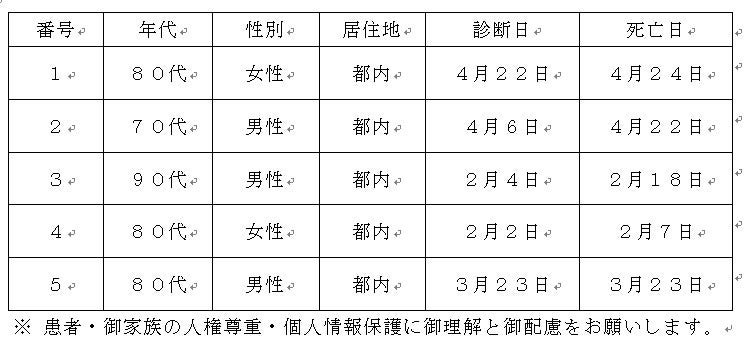 都内で新型コロナウイルスに感染した方が死亡されましたのでお知らせします。