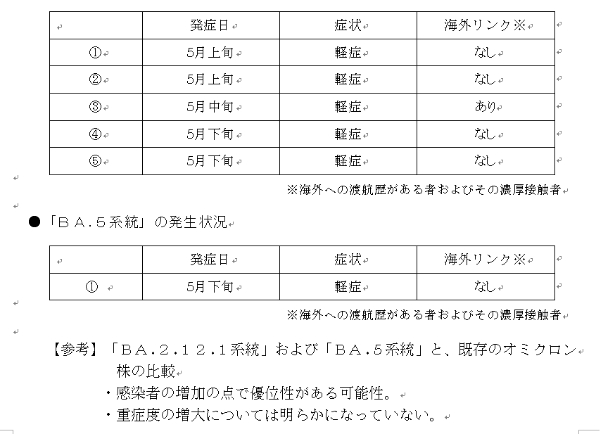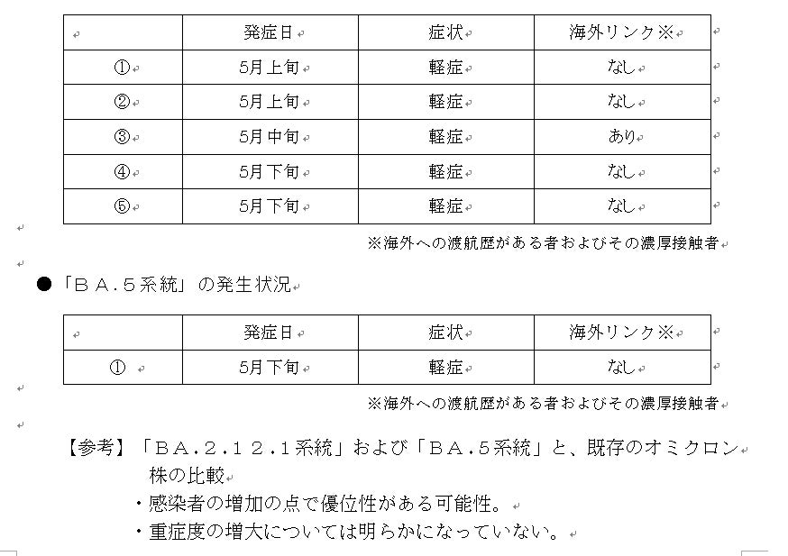 この度、健安研等においてゲノム解析を行った結果、新たに、オミクロン株の亜系統である「BA.2.12.1系統」を5例、「BA.5系統」を1例、「BA.1系統とBA.2系統の組換え体」を2例確認したため、下記のとおり、お知らせいたします。