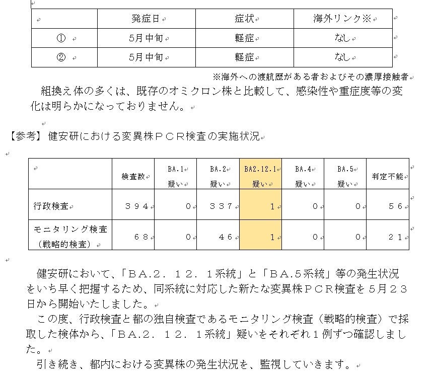 オミクロン株の亜系統「BA2.12.1系統」と「BA.5系統」、「BA.1系統とBA.2系統の組換え体」の確認について
