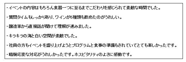 ・ワインすべてが手作りという話をきいて素敵だと感じました。 ・イベントの内容はもちろん食器一つに至るまでこだわりを感じられて素敵な時間でした。 ・質問タイムもしっかりあり、ワインが5種類も飲めたのがうれしい。 ・醸造家から直接話が聞けて理解が進みました。 ・キラキラの海と白い空間が素敵でした。 ・社員の方もイベントを盛り上げようとプログラムと食事の準備もされていてとても楽しかったです。 ・臨機応変な対応がうれしかったです。ホスピタリティのよさに感動です。 |