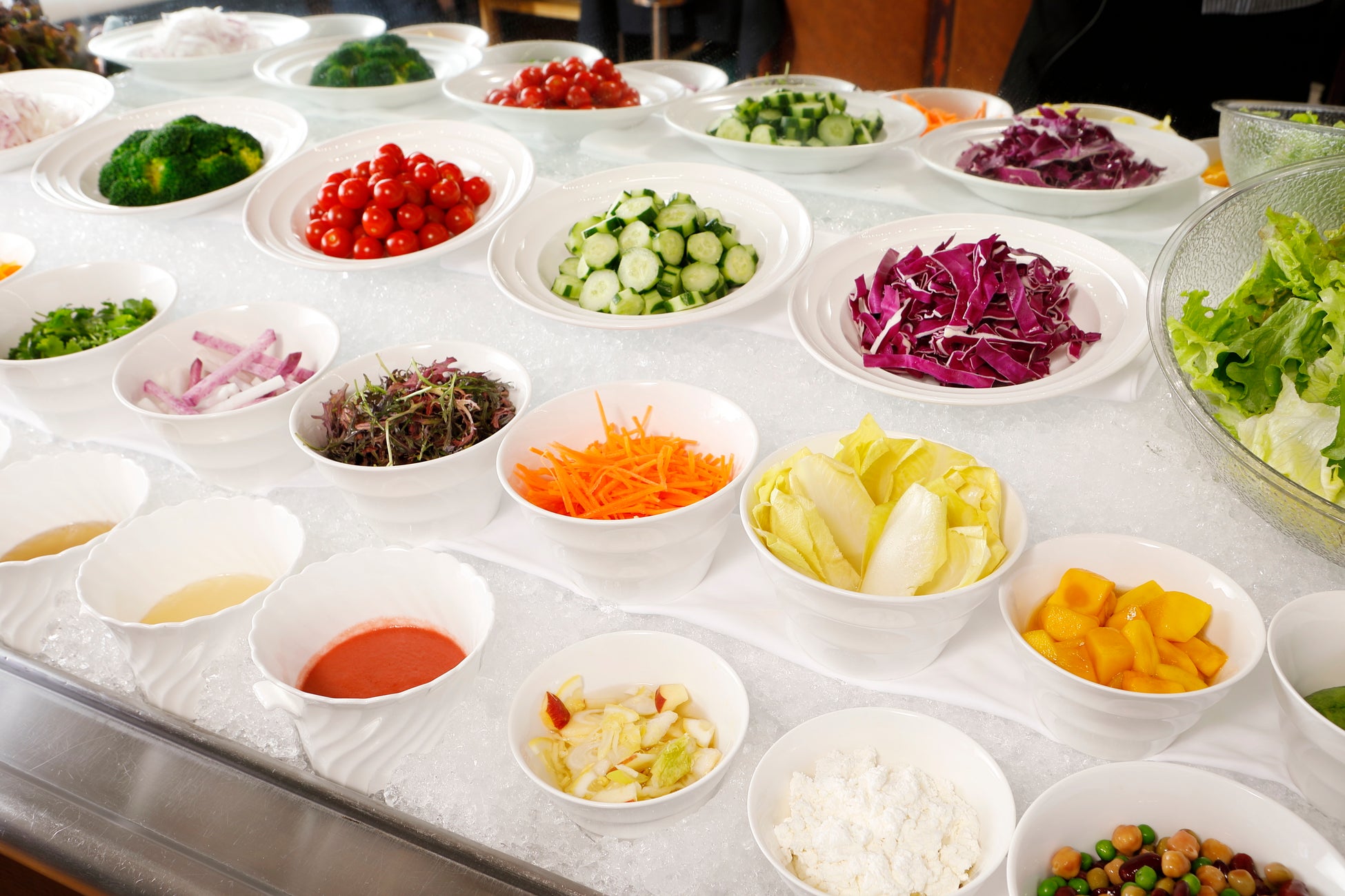 まず始めに、ホテルニューオータニ専用の畑で収穫される栄養価高い新鮮な野菜のほか、シェフが選びぬいた野菜が勢揃いする「健康野菜のサラダバー」をお愉しみいただきます。お肉料理の前に野菜を摂ることは血糖値の上昇を緩やかにし、脂質の吸収を抑制するなどの効果があるともいわれています。野菜不足の毎日に嬉しい、サラダバーでたっぷりビタミン補給を。次に、桜海老をふんだんに使用したスープをご用意。ホテル伝統の製法で4日間かけて作り上げるコンソメスープに濃厚な海老の出汁をプラスし、コク深い味わいに仕上げました。