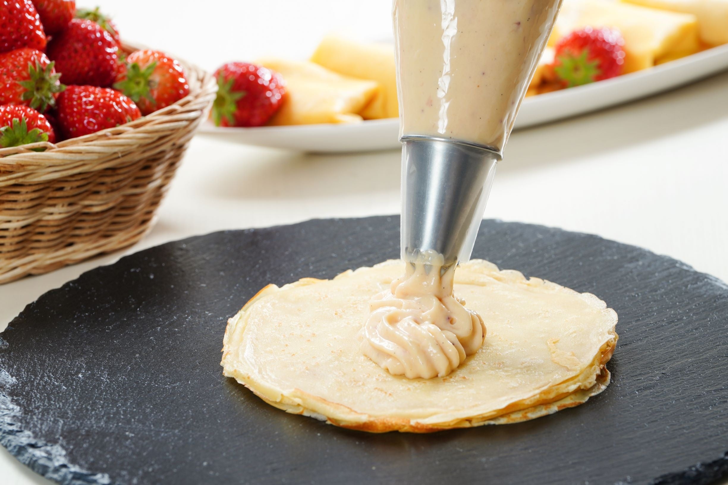 また、ライブキッチンでは、生地の甘い香りが食欲をそそる「いちごカスタードのクレープ」、パテとバンズを目の前で焼いて仕上げる「ハンバーガー」などをご用意いたします。