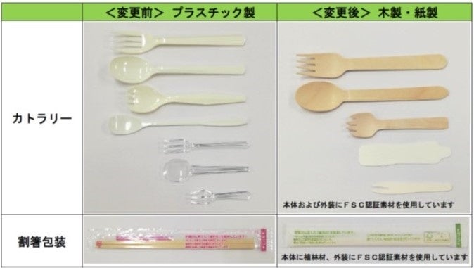 このたび、上記の削減目標を達成するための取り組みをさらに推進し、2022年度上期中に、使い捨てプラスチック素材から紙や木製といった環境配慮型素材のカトラリーに切り替えます。