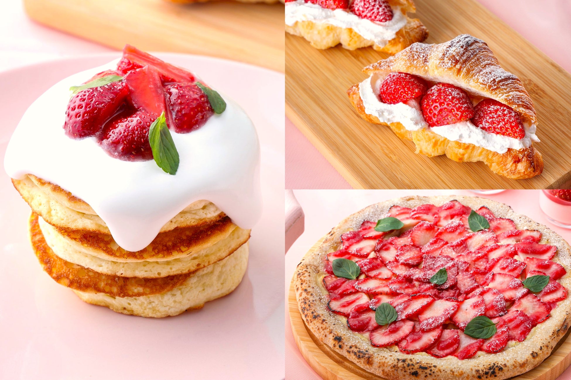 温かいふわふわのパンケーキを重ねて、その上に軽くホイップした生クリームソースと、フレッシュいちごを飾ったカフェ風パンケーキ「ふわふわパンケーキ いちごソース」(写真左)、また、店内で焼き上げる「いちごとマシュマロカスタードのピッツァ」(写真右下)にホテルメイドのクロワッサンといちごの相性が抜群の「いちごクロワッサン」(写真右上)も登場します。