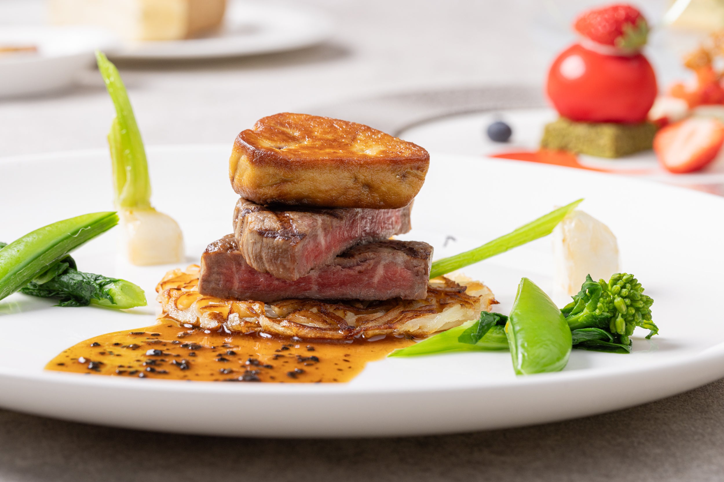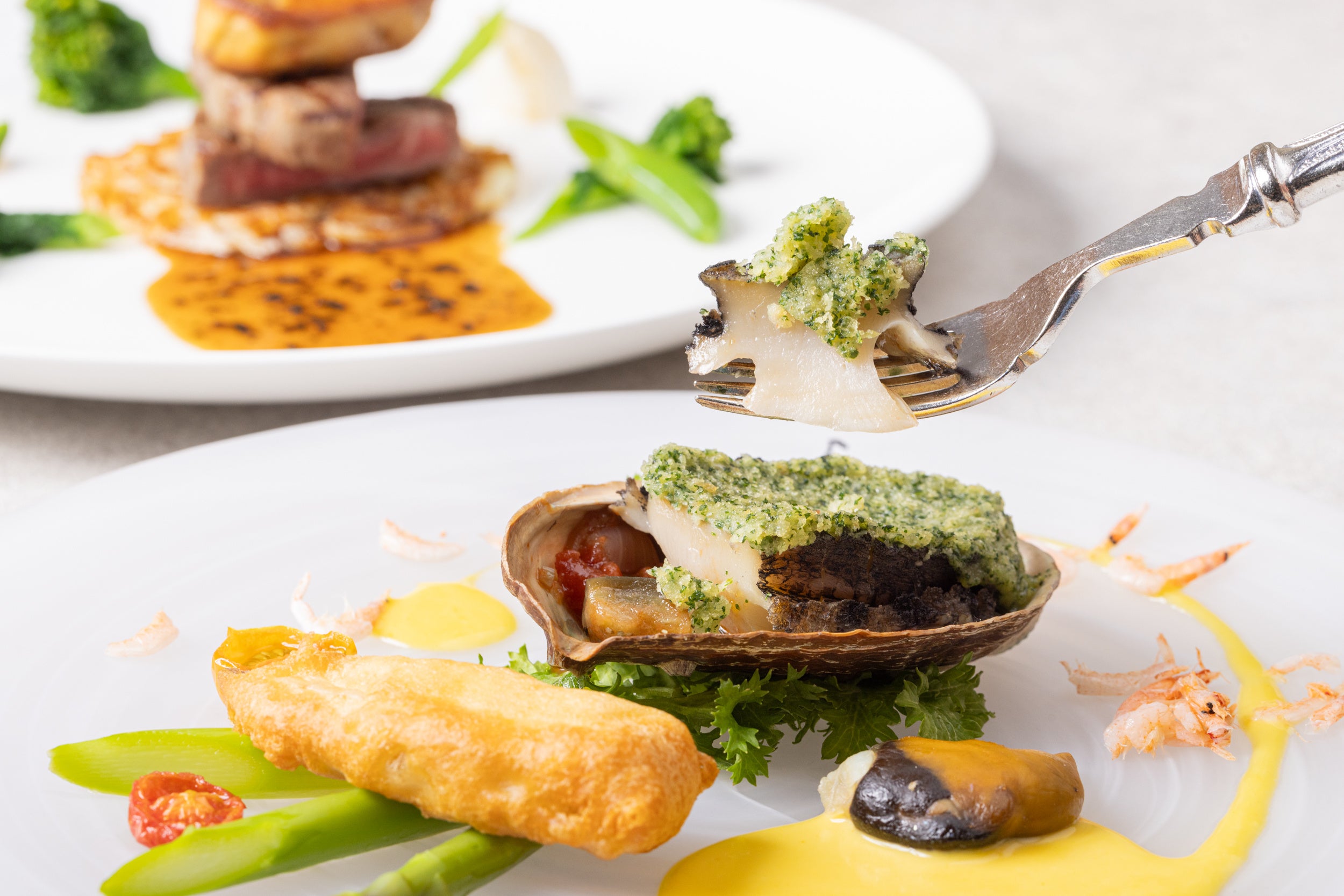 約130gの鮑は、新鮮な身の弾力を活かすために火入れに拘り、貝類によく合うエスカルゴバターを合わせました。黒毛和牛のグリエには、牛すじを香ばしく焼いて煮出したジュ・ド・ブッシュソースでお召し上がりいただきます。