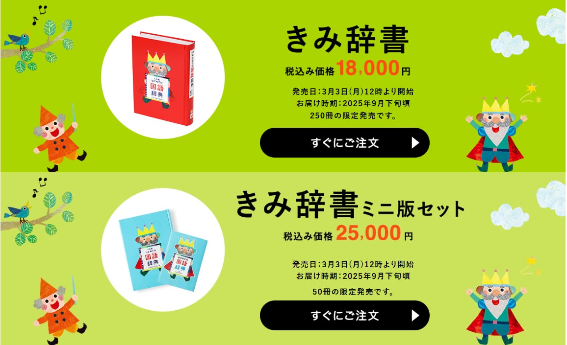 きみ辞書通常版は250冊、きみ辞書ミニ版セットは50冊の数量限定となり、限定数に達し次第、販売数量となります。なお、1冊ずつ制作するため納期にはお時間をいただきまして、発送は2025年9月下旬となります。
