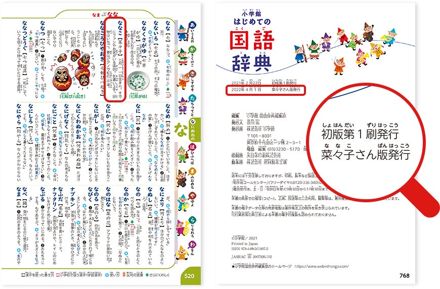 お子さまの名前と誕生日、そして語釈として全角40文字までの紹介文が掲載可能で、名前の由来、好きな遊びや食べ物、将来の夢など、購入者が自由に作成。これをプロの辞書編集者と辞書校閲者が編集・校正して、辞書の項目の中に自然な形で挿入します。