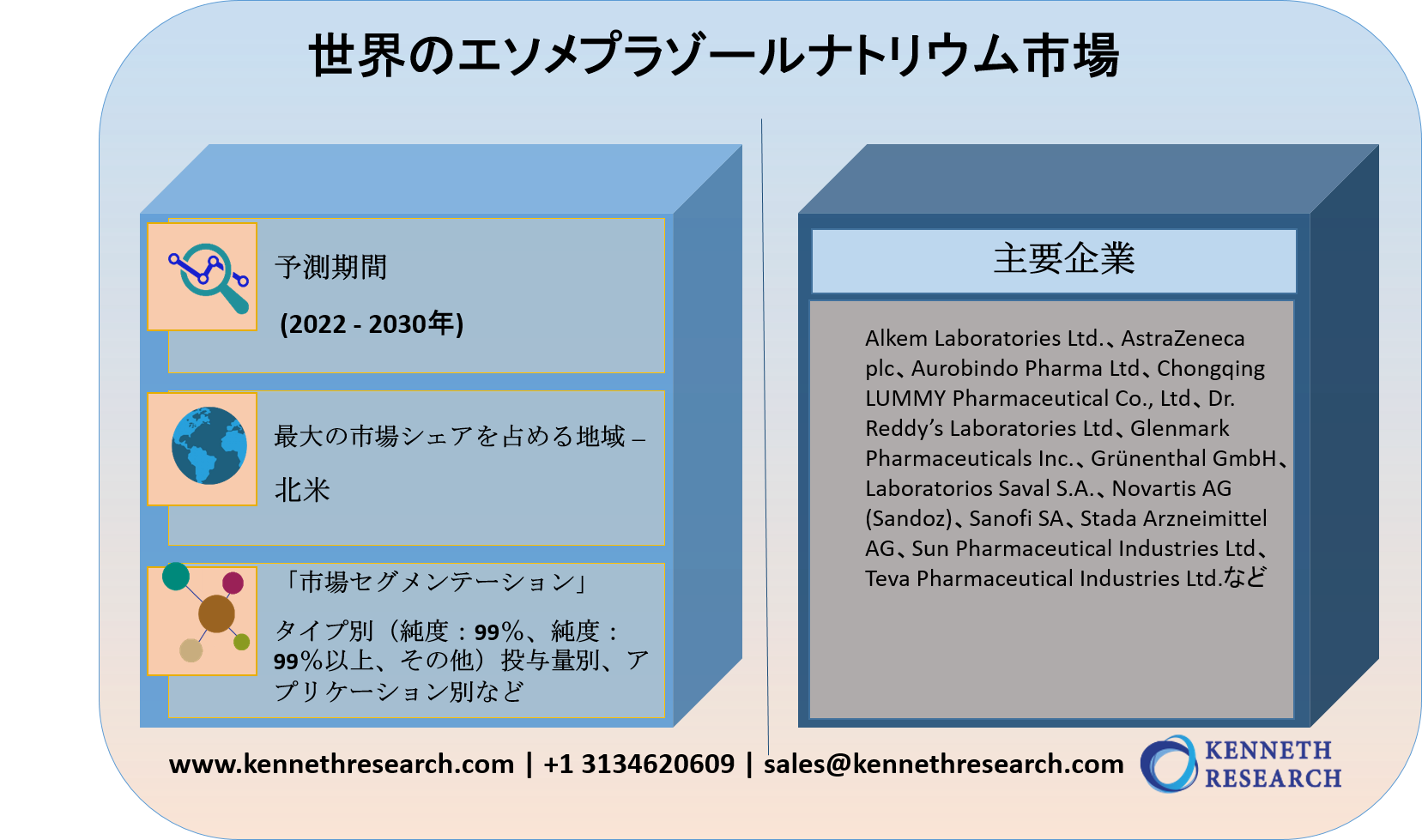 Kenneth Researchは調査レポート「世界のエソメプラゾールナトリウム市場:世界的な需要の分析及び機会展望2030年」を2022年2月 28日 に発刊しました。これは、詳細な市場の業界需要分析と市場の成長に影響を与えるさまざまな要因を提供します。レポートは、予測期間、市場価値、市場ボリューム、成長率、セグメント、市場プレーヤー、成長ドライバーを含む市場の成長を提供します。調査方法には、市場の評価と予測データの計算に基づく履歴データと現在のデータの収集が含まれます。このレポートのデータ収集には、一次調査と二次調査の両方が含まれます。