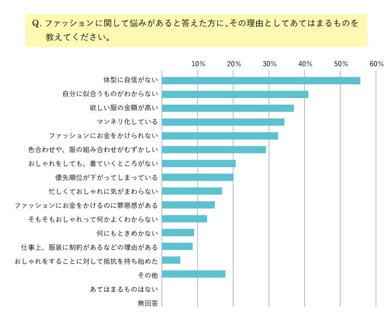 続けて、ファッションに関するお悩みがある人に「その理由として、あてはまるものはありますか?」とたずねたところ、「体形に自信がない」が56.6%、「自分に似合うものがわからない」が40.7%、「欲しい服の金額が高い」が35.3%と目立ちました。さらに、「マンネリ化している」が34.4%、「ファッションにお金をかけられない」が32.6%などが続きます。年齢を重ねる中で、どのようなファッションが自分に似合うのか迷子になっている方が多く見受けられそうです。また、出産や育児、住み替えなどライフステージの変化によって、自分のために時間やお金をうまく着かない環境もありそうです。