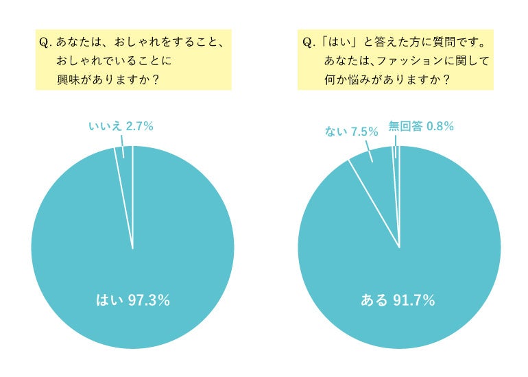 「おしゃれをすること、おしゃれでいることに興味がありますか?」と質問したところ「はい」が97.3%「いいえ」が2.7%の回答結果となりました。次に、「はい」と回答した人へ「ファッションに関して何か悩みがありますか」と質問したところ、「ある」が91.7%、「ない」「無回答」が計8.3%と回答し、9割を超える多くの人が、ファッションに関して興味はあるが何かしらの悩みを抱えていることがわかりました。