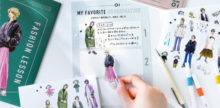 テキストに登場したコーデのイラストシールを使い、参考にしたいコーデや取り入れてみたいアイテムを選んで記録します。お気に入りの写真をコラージュするように貼ってかわいいシートが完成させる過程を通し、好みを可視化することで、自分自身のファッションの理解が深まり、おしゃれの自信にも繋がります。初回に届くバインダーに綴じれば、自分だけのスタイルブックが完成します。