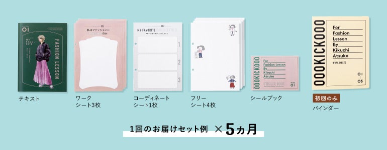 テキスト、ワークシート、コーディネートシートのほか、イラストシールブック、フリーシートが毎月届きます。シールは毎月たっぷり楽しめる21コーデ×2セットです。(初回のみオリジナルバインダーが届きます)