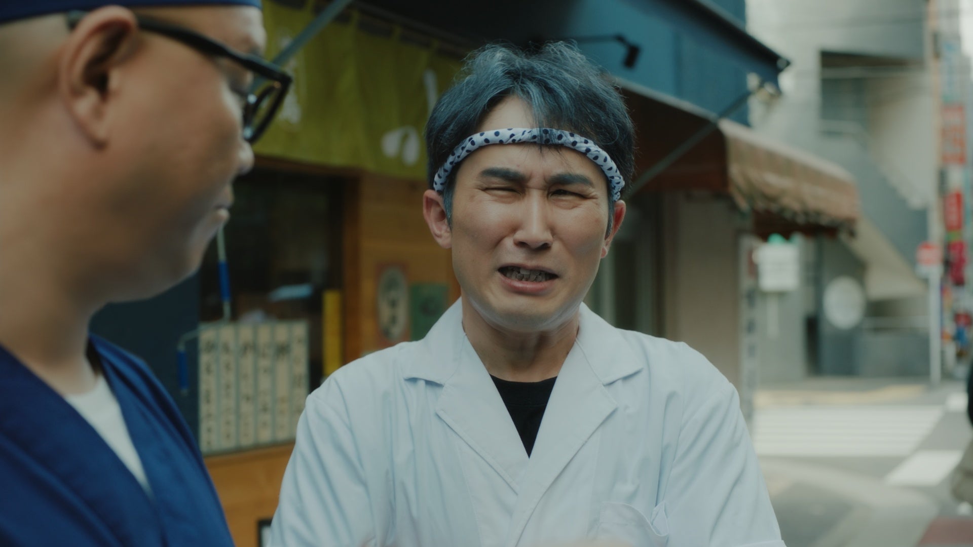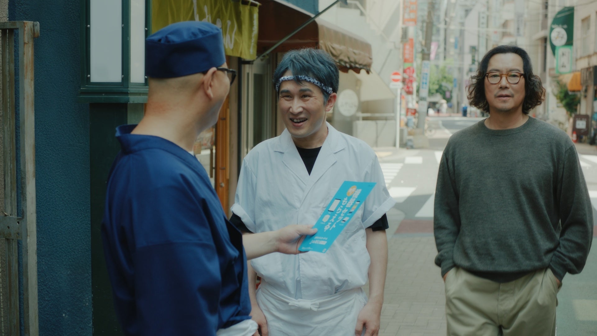 隣の店主役として登場したじろうさんと長谷川さんが、店先で“Airレジ オーダーってどうなの?”と立ち話。導入をためらうじろうさんに対して、「サポートがちゃんとある」「機器セットがもらえる」など、実体験を交えて、背中を押す会話劇となっています。さらに会話の途中では、通りがかった長谷川さんの店の常連客の豊川さんが、じろうさんに突然肩を組まれて絡まれるという、コミカルでテンポのいいやりとりも。導入にまつわる“本音と不安”を、笑いを交えながら描いた、親しみやすいCMに仕上がっています。