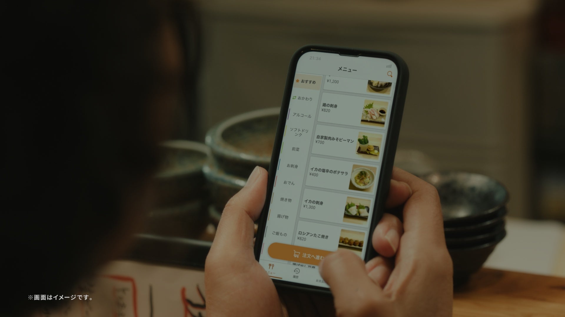 注文のタイミングを逃してしまった染谷さん演じる後輩が、先輩の豊川さんに促され、『Airレジ オーダー』で追加注文したのはまさかの舟盛り。予想外の高額な注文に内心は驚きつつも微笑ましく見守る豊川さんの反応と、ギャップのある表情演技が見どころです。気まずさを避けつつ、好きなタイミングで追加注文できるという『Airレジ オーダー』ならではの“気軽さ”と、それが店舗にとっては売り上げチャンスにつながるメリットを、クスッと笑えるやりとりで表現しています。