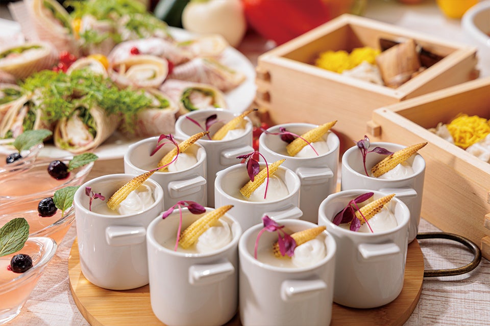 冷製料理には、コーンの自然な甘みとサワークリームの酸味が爽やかな味わいを生み出す「ホワイトコーンのフラン」や、お子さまが手づかみでも食べられる「生ハムとポテトサラダのトルティーヤ」などをご用意しました。