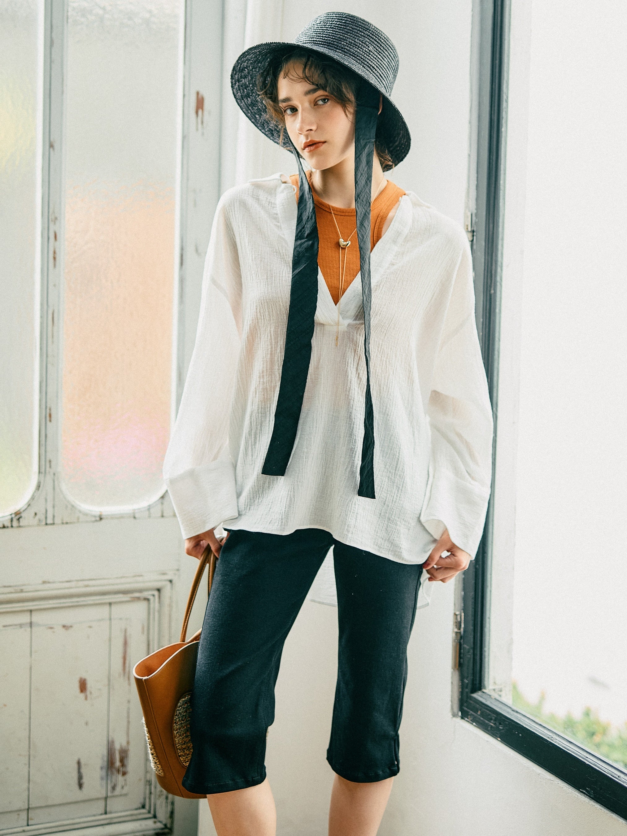 エアリーなシャツにカプリパンツを合わせたトレンドスタイル。ナチュラル素材の小物でシーズンムードを高めながら都会的なバランスに仕上げました。
