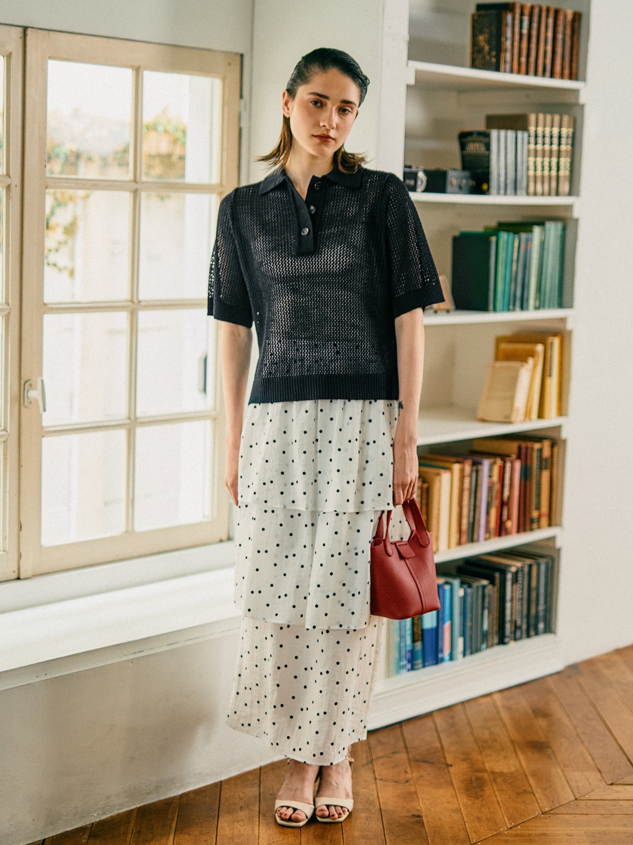 エアリーなドットスカートに透かし編みもポロニットを合わせた、軽やかなMARINEスタイル。クリーンで洗練された印象を演出し、差し色のバッグでさりげない遊び心をプラスしたスタイリングに仕上げました。