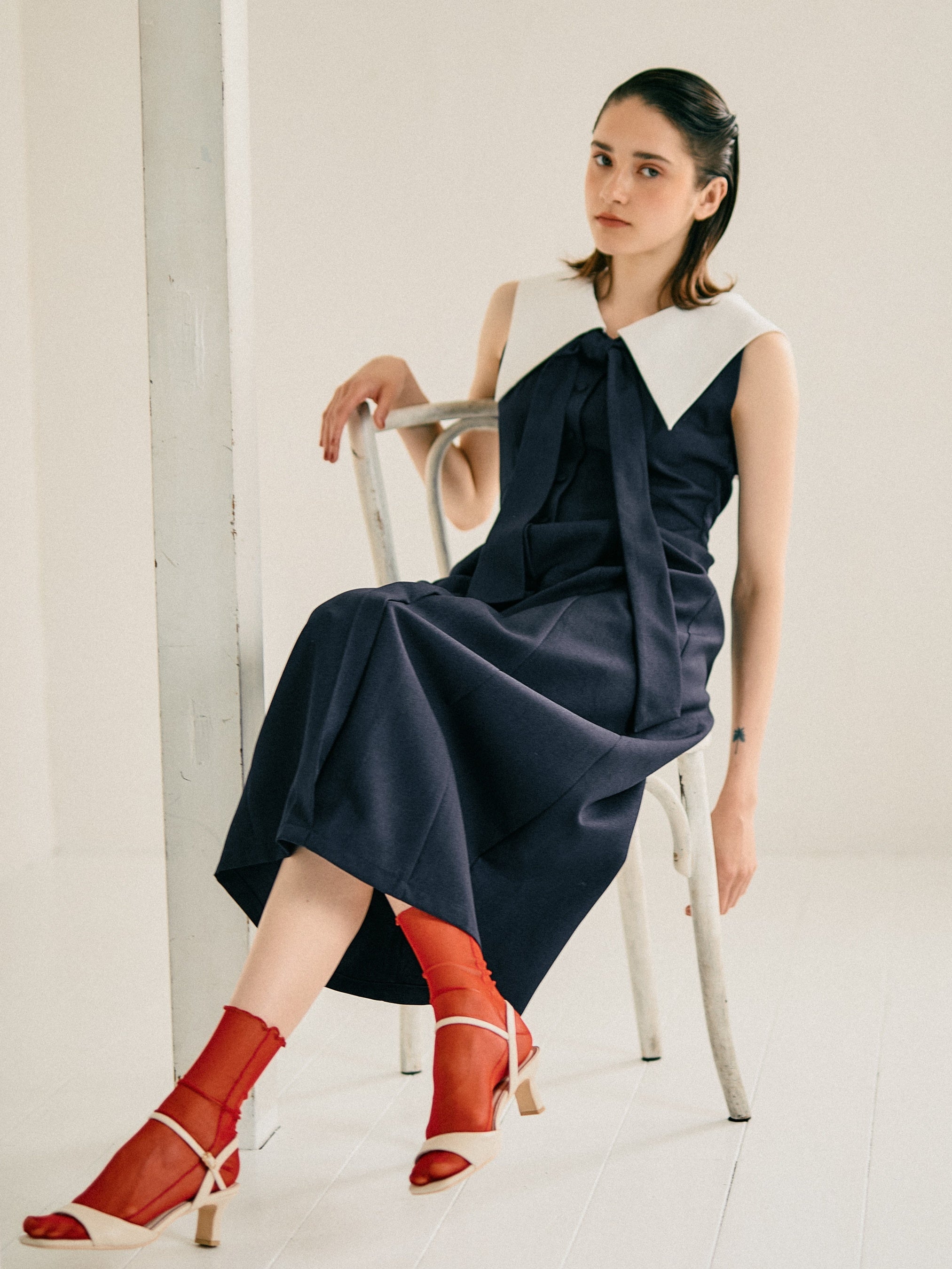 セーラーカラーが目を惹くワンピース。洗練された印象を引き立てつつ、配色のコントラストが程よい存在感をプラスします。