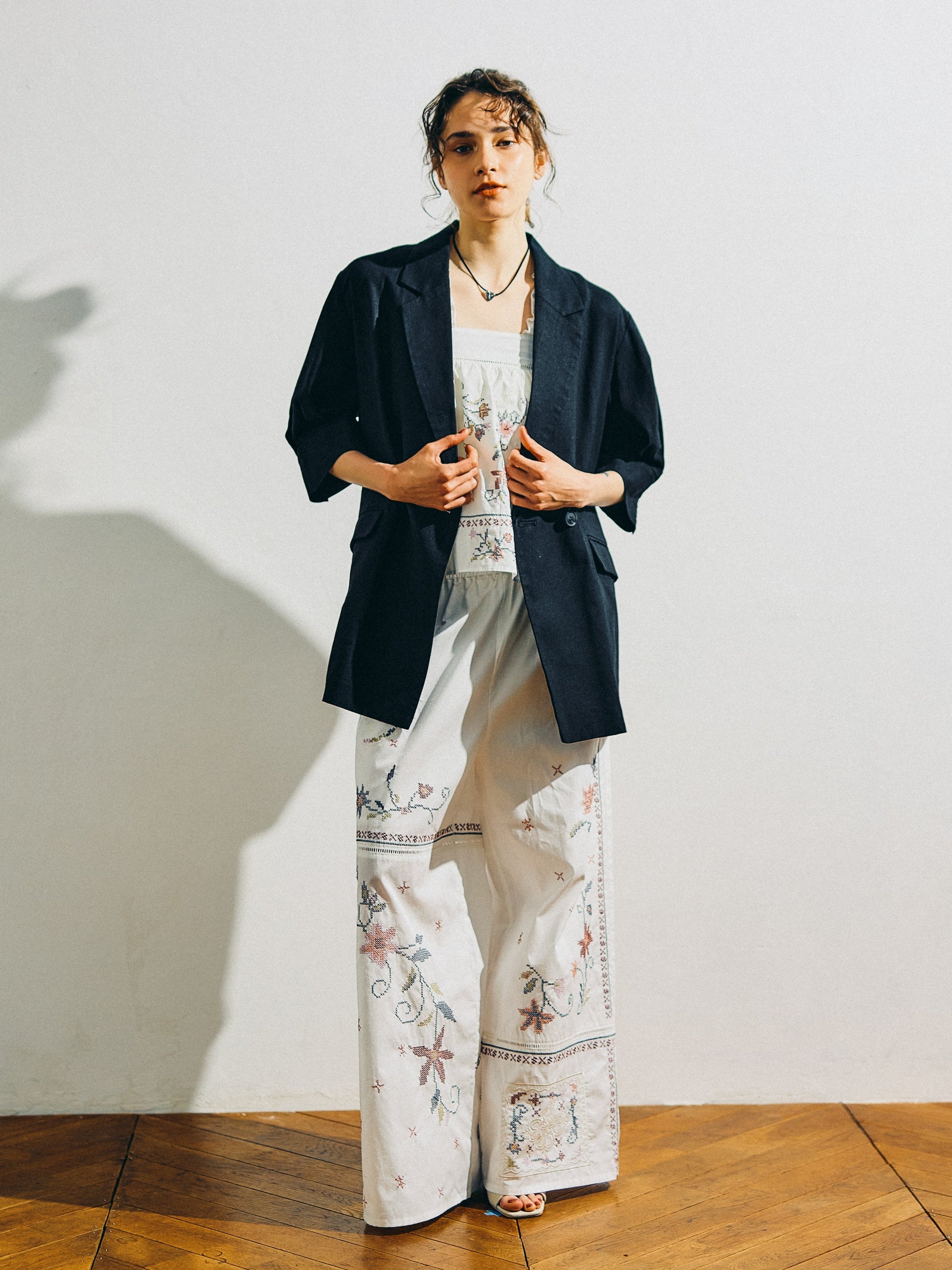 ナチュラルな風合いの刺繍アイテムを主役に、リラックス感のあるBOHOスタイル。繊細な刺繍が施されたセットアップに、軽やかなジャケットを合わせることで、ラフさの中にも程よいきちんと感をプラス。