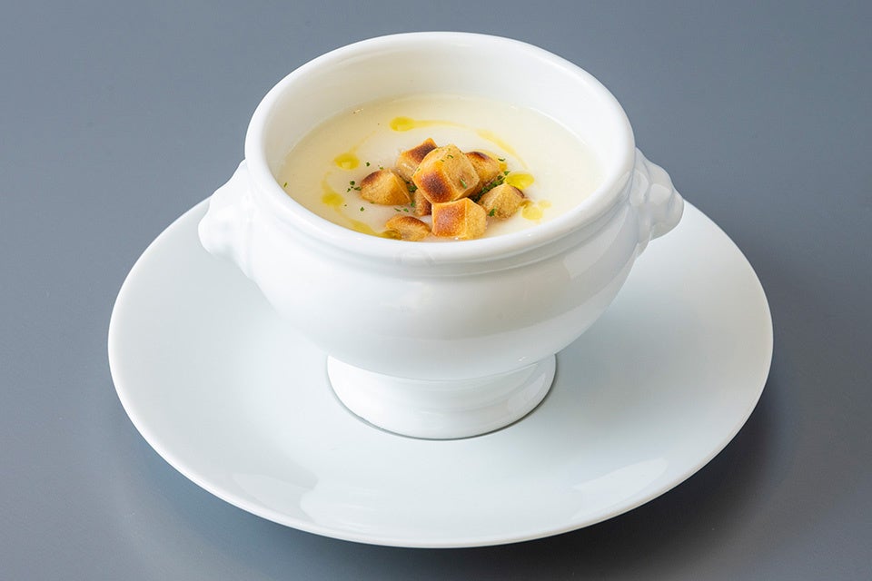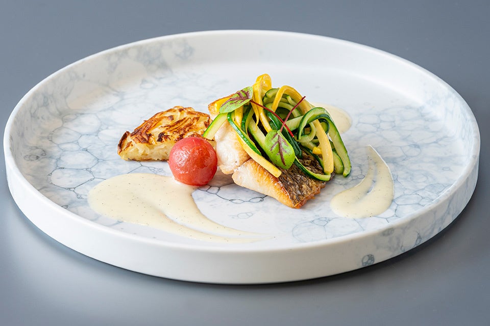 コースの前菜は「諫早産諫美豚」を使用したパテドカンパーニュをご用意しました。諫美豚(かんびとん)は自然豊かな諫早平野で自社栽培した食用のお米を食べて育ったため脂が上質ですっきりとした後味が特徴です。臭みやアクが少なく、一般的な豚肉よりも脂に甘みがあり、柔らかくジューシーな味わいが楽しめます。いろいろな部位を入れることによってほろりとした食感になるため、うで、もも、ロース、レバーをペーストし混ぜ合わせ焼き上げました。魚料理は「五島産養殖クエ」を使用。クエは美しい白身で上質な味わいを楽しめる幻の魚と言われており、スチームで蒸すことによって水分が多く、しっとり柔らかい食感に仕上がります。クエの骨とガラで作ったブールブランソース、人参とオレンジのピューレと共にお召し上がりください。