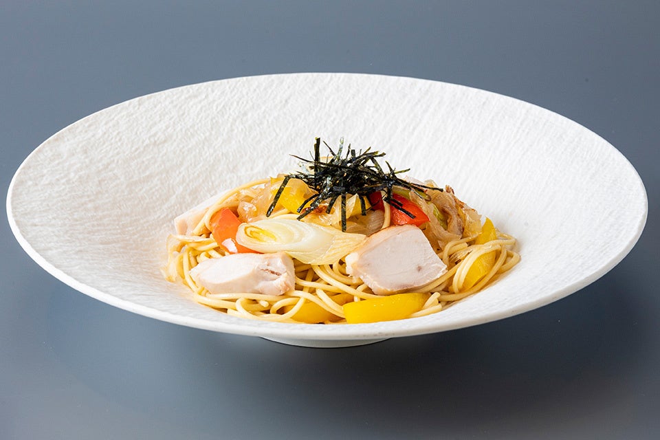 アラカルトでは、五島うどんと同じ製法で作った手延べスパゲッティを使った3種のパスタが登場いたします。通常のパスタよりコシがあるのが特徴の麺に「島原産甲イカ」や「羽カツオの燻製」、「地鶏しまさざなみ」など長崎の食材を合わせました。
