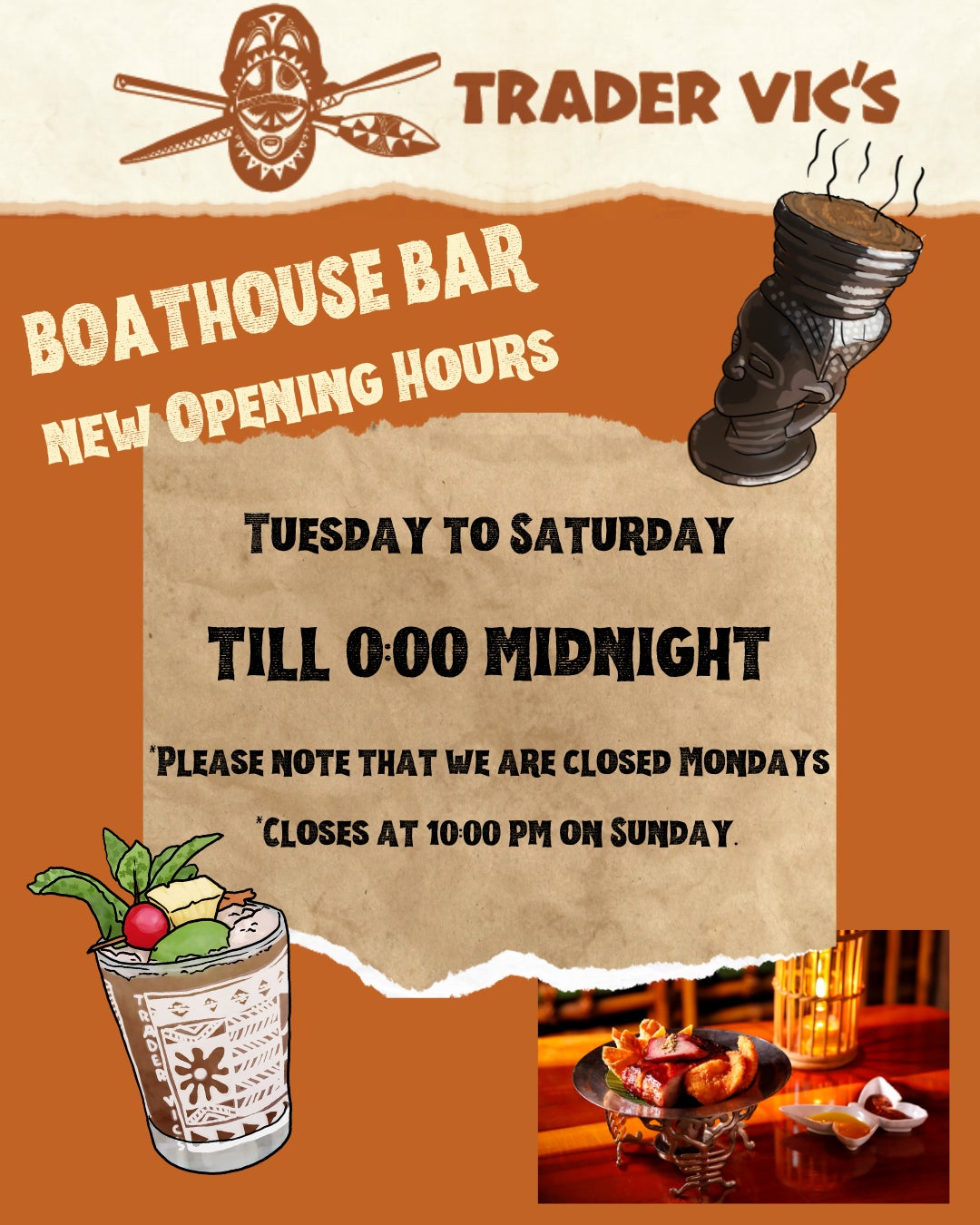 ランチタイムは自然光が入るダイニングで、ディナータイムはエキゾチックな雰囲気のバーエリアでお愉しみいただけます。現在「トレーダーヴィックス 東京 ボートハウスバー」では、平日16:30~19:00の期間で「トレーダーヴィックス 東京」のシグネチャーカクテル『マイタイ』をはじめ10種類以上のカクテルやビールをお手頃価格で堪能できる『ハッピーアワー』を実施中。お仕事帰りのディナー前にぜひ。