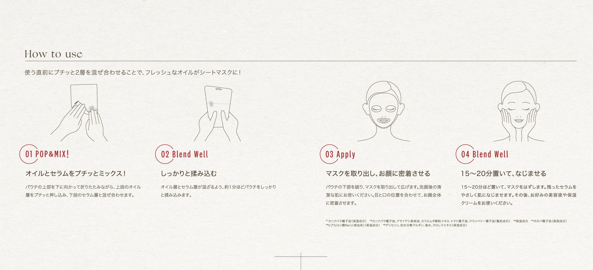 オイル層とセラム層だけでなく、マスク素材自体にも美容成分を配合したシートマスクで、お肌をたっぷりの潤いで包み込みます。