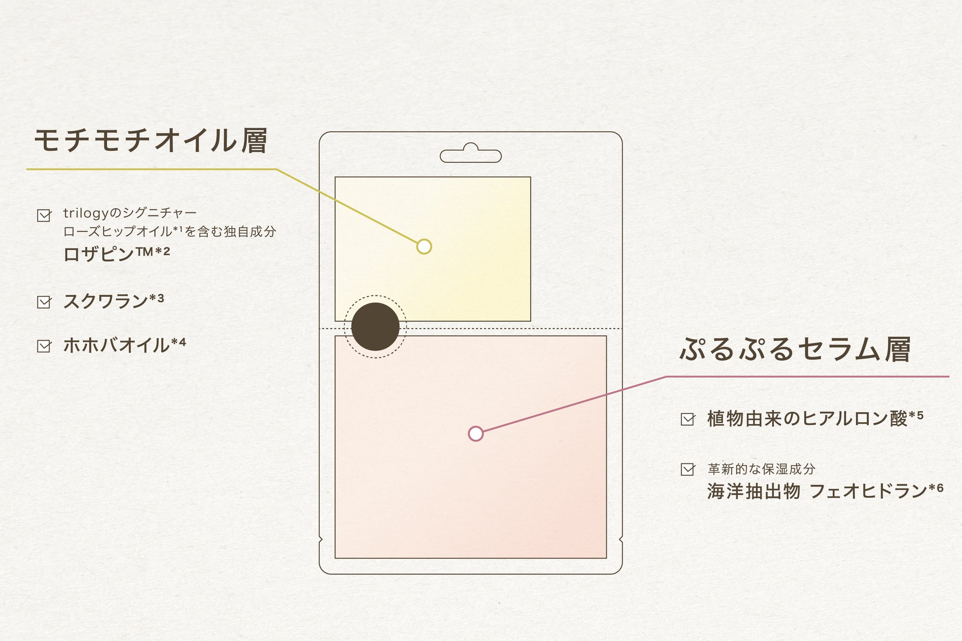 上部のオイル層は、trilogyのシグニチャーであるローズヒップオイル*⁵を含む独自成分「ロザピン™*¹」と、スクワラン*⁶、ホホバオイル*⁷のトリプルオイルブレンド。