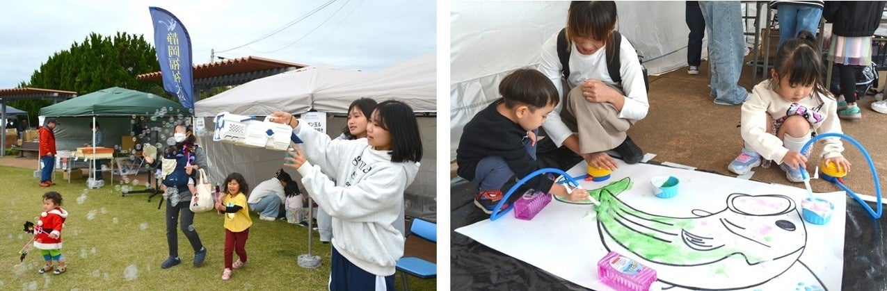 子ども向けの参加型企画として、しゃぼん玉で遊べるコーナーと、色のついた泡で塗り絵を楽しむ「あわあわお絵描き」コーナーも開設。いつもは「下から見上げる」「登って眺望を眺める」だけになってしまいがちな灯台の前で、ものづくりや遊びを体験していただく機会を提供しました。